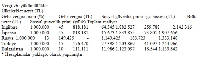 Aşağıdaki tablo futbolcuların aynı net ücret varsayımı altında bazı ülkelerdeki vergi ve sigorta yükümlülükleri ve kulüplere olan maliyetlerini gösteriyor.